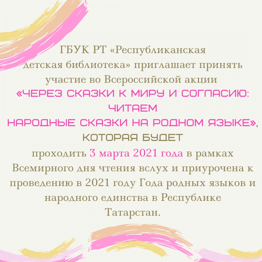 Республиканская детская библиотека приглашает принять участие во Всероссийской акции «Через сказки к миру и согласию: читаем народные сказки на родном языке», которая будет проходить 3 марта 2021 года в рамках Всемирного дня чтения вслух и приурочена к проведению в 2021 году - Года родных языков и народного единства в Республике Татарстан.