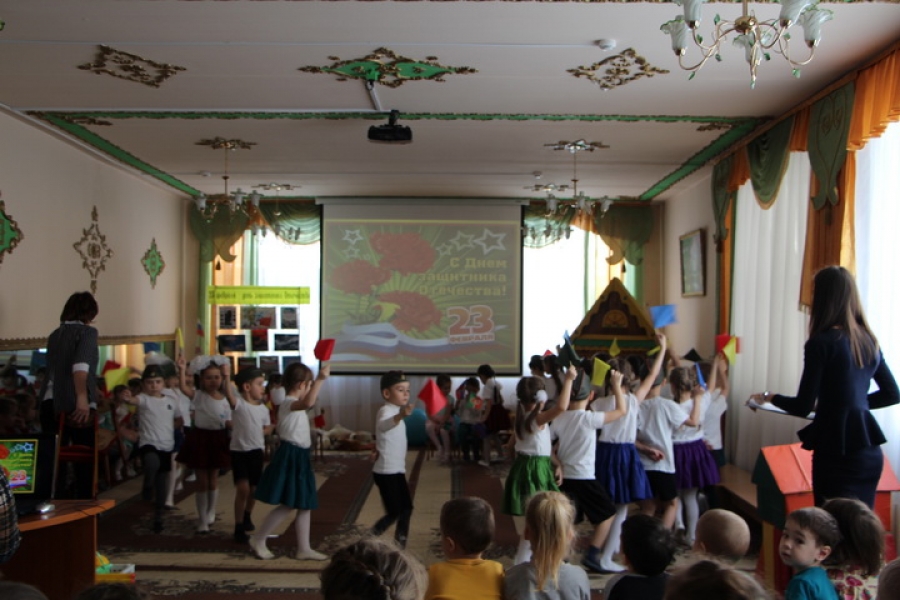 Музыкальный утренник для детей сопровождался красочной презентацией с демонстрацией видеоклипа военных парадов, полетов самолетов и запуска ракет под песню Д. Майданова «Я поднимаю свой флаг моего государства».